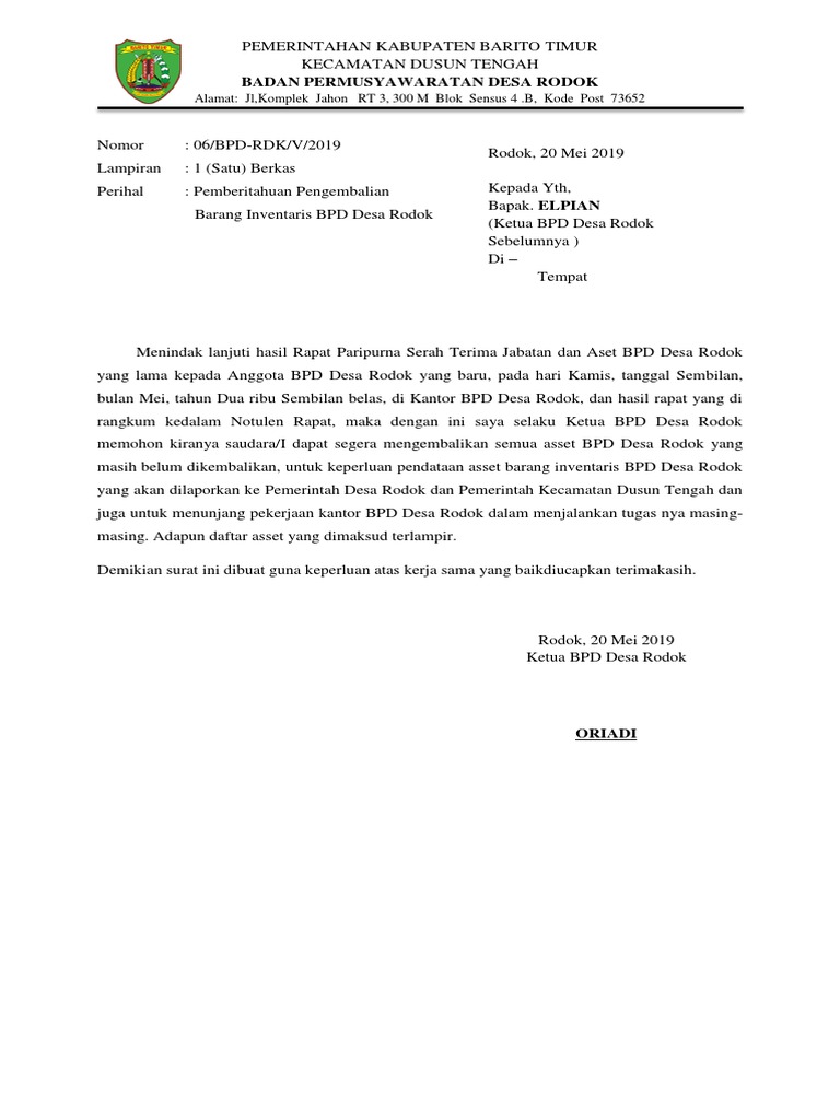 Contoh Surat Pernyataan Pengembalian picture posted and submitted by Gambarinus that preserved inside our collection. Berupa copy dari asli berita acara pengembalian barang bukti berupa tanah seluas 450 meter persegi sertifikat hak milik no. Contoh berita acara serah terima barang.